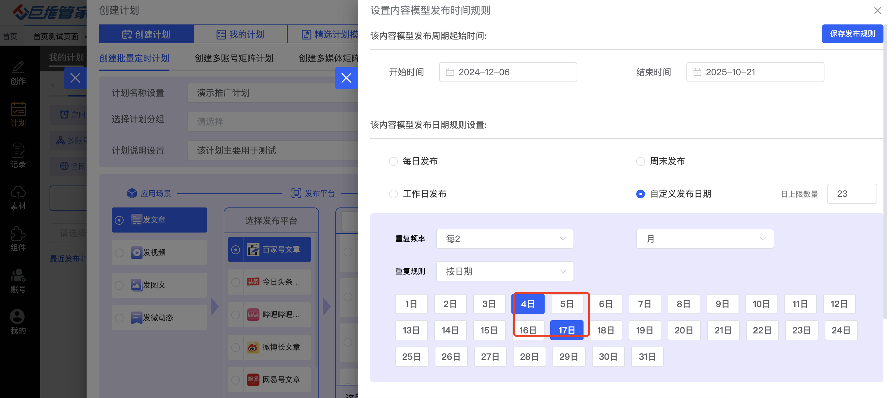 此外,巨推管家的定时计划功能也让我们受益匪浅。我们可以根据自己的需求创建定时计划、批量定时计划、多账号矩阵计划等,满足不同时间段和不同平台的推广要求。这不仅提高了我们的推广效率,还让我们的推广更加精准和有效。