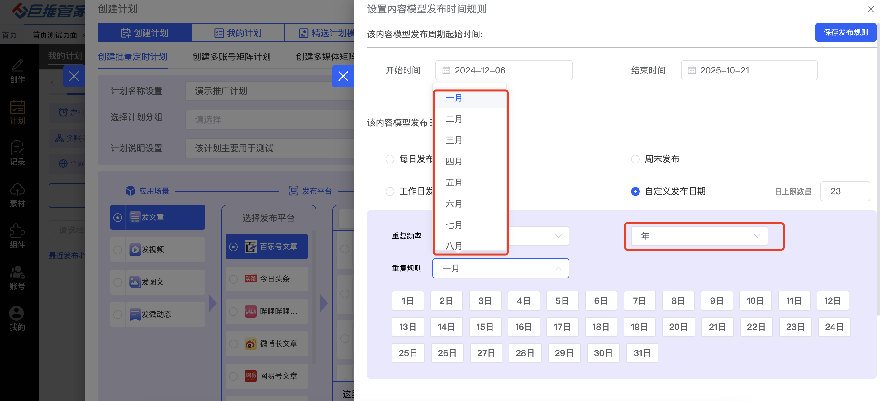 此外,巨推管家还具备定时计划功能。你可以通过创建定时计划、批量定时计划、多账号矩阵计划、多媒体矩阵计划等,来满足不同需求的推广要求。而且,这款软件的计划自定义性能极强,你可以根据自己的需求来设定不同的日期规则和时间段,实现更加精准和灵活的营销推广。