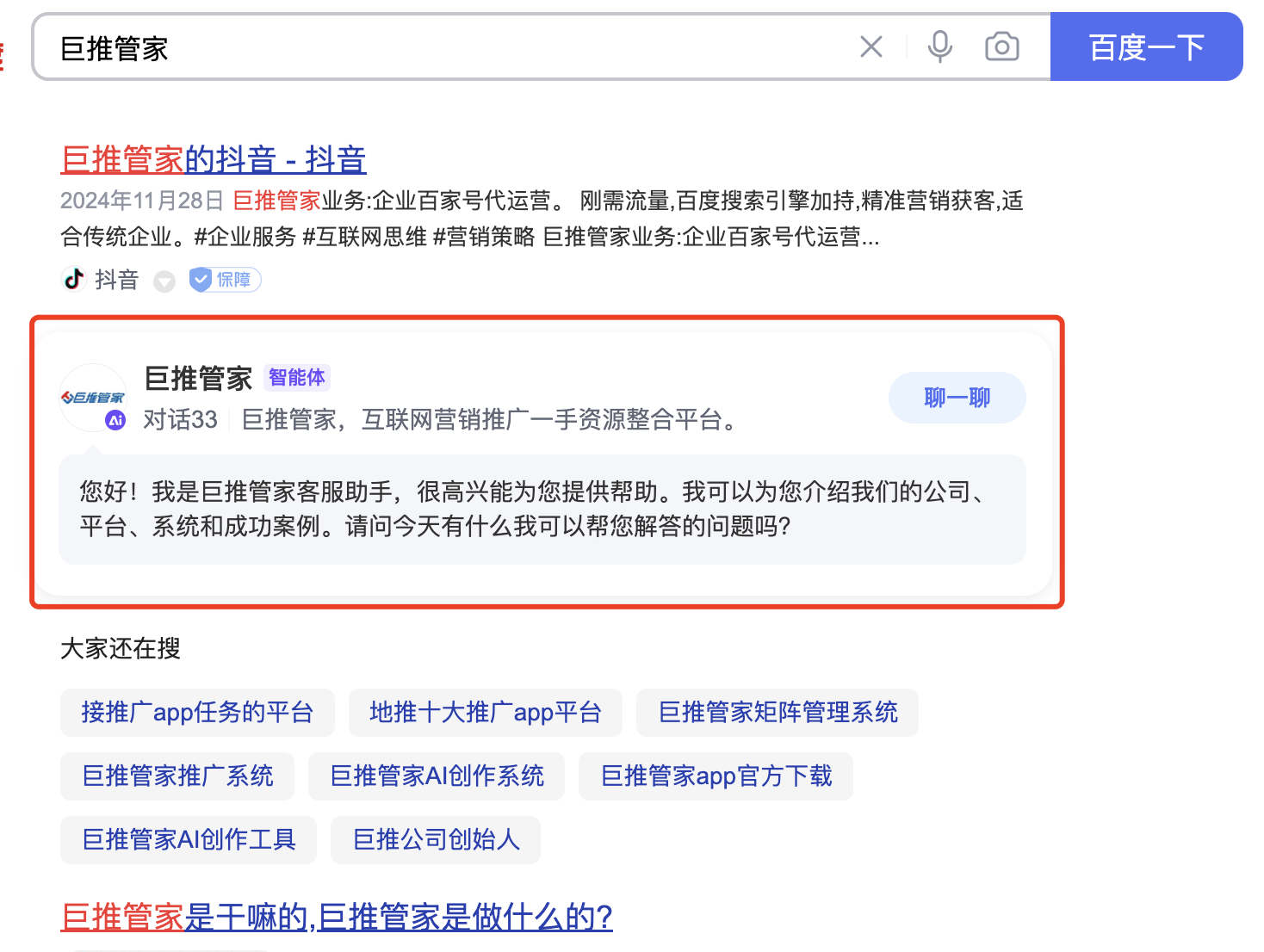 作为巨推公司的一名推广人员,我很高兴地告诉大家,我们巨推管家专门上线了百度智能体代创建、代注册、代申请的服务。你没听错,就是全程帮你搞定,让你省心省力。我们巨推管家作为网络推广的一手资源整合平台,有着丰富的经验和资源,能够确保你的百度智能体顺利申请通过,还能帮你巧妙地在智能体内留下联系方式,提高客户转化率。