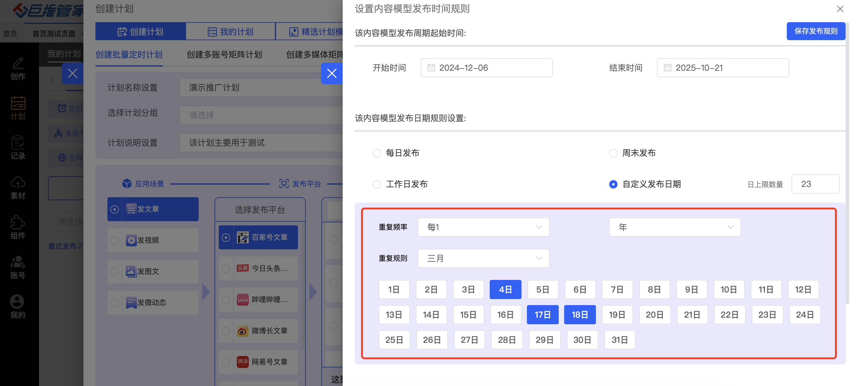 在内容发布方面,巨推管家更是展现出了其一体化的强大功能。从创作到账号管理,再到内容发布,巨推管家都能够轻松应对,大大降低了企业主们需要使用多款软件才能实现新媒体推广的门槛。而定时计划功能,更是让企业主们能够根据自己的需求,设置年、月、周、日、时不同日期规则和时间段的推广计划,实现了精准营销和高效推广。